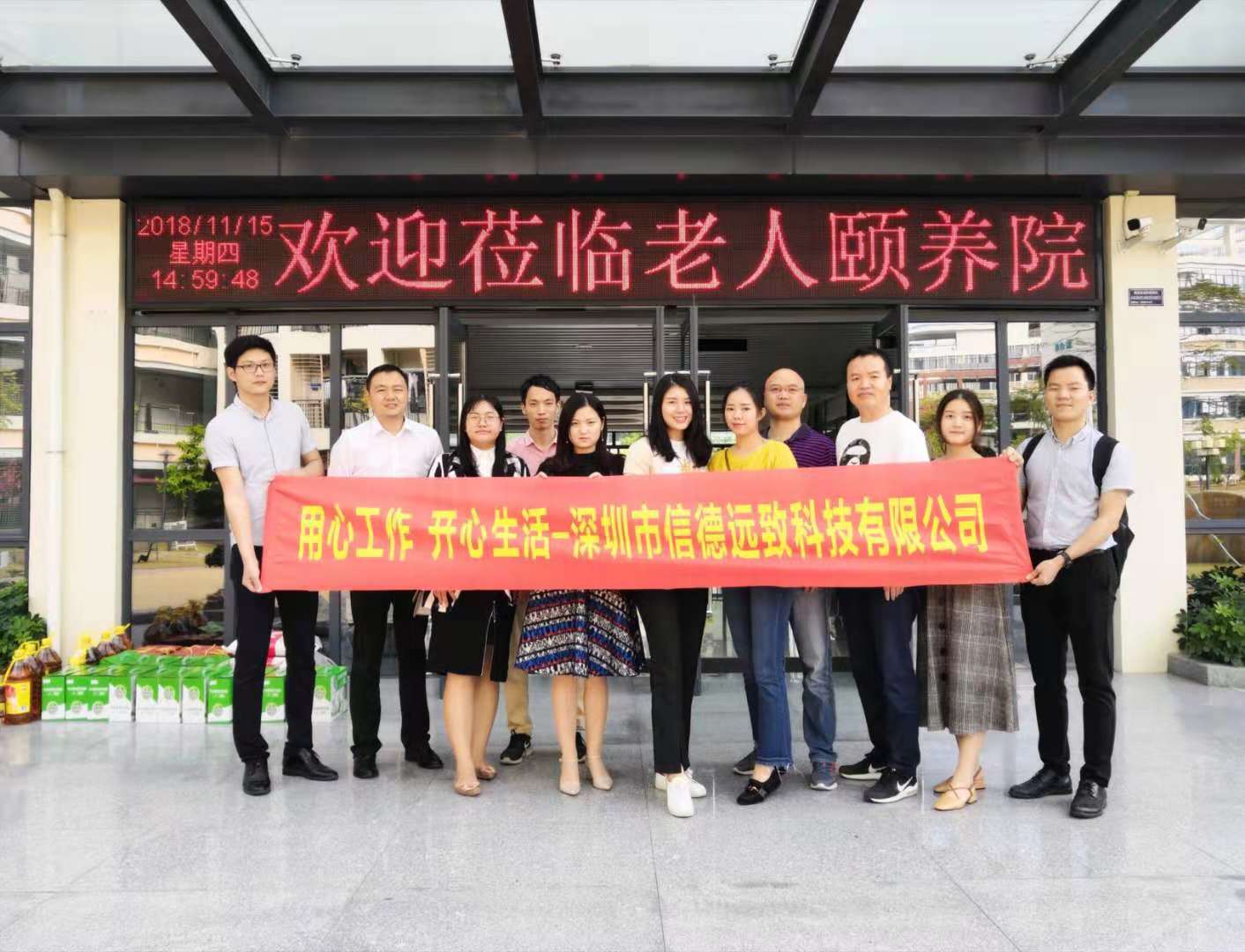 下午15:00点,伙伴们带上了准备好的大米、食用油和洗手液等礼品来到了深圳市社会福利中心老人颐老院赠送给该院的老人们使用。